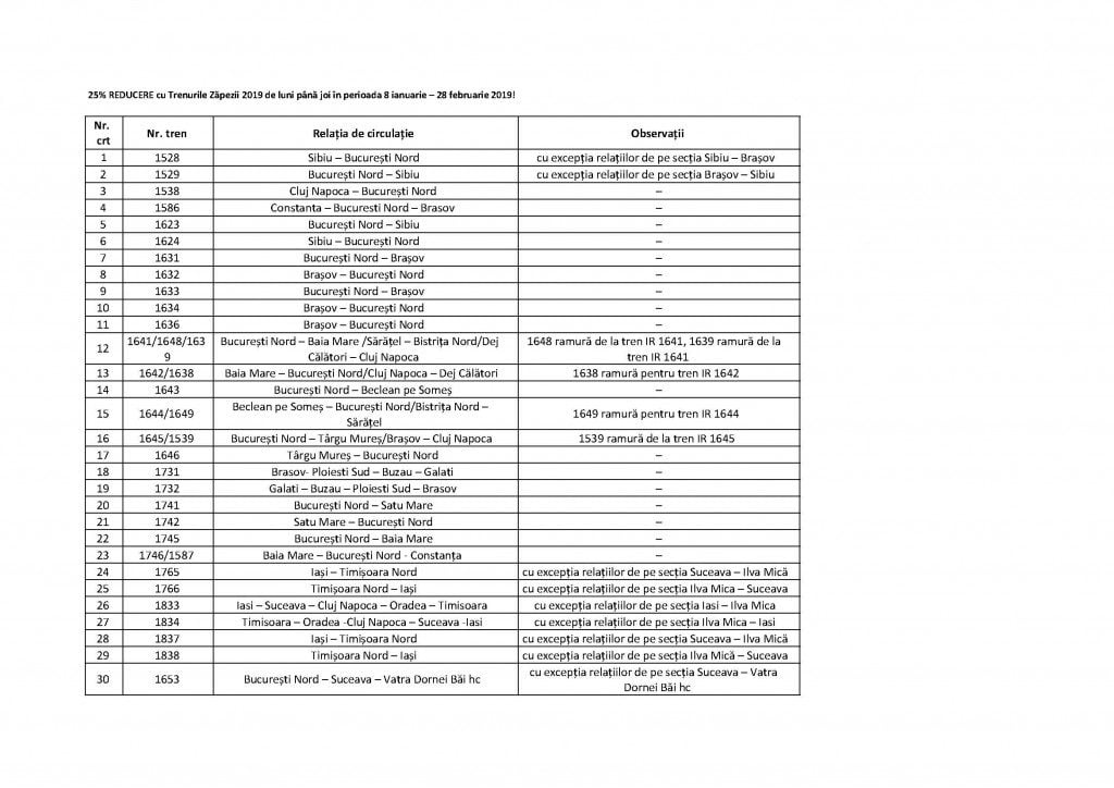 Reducerile tarifare se acordă pentru toate trenurile prezentate în tabel: