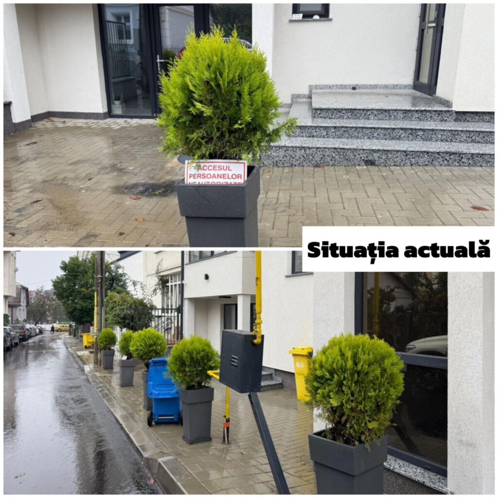 Astăzi, după trei luni, situația persistă: cutia de gaz metan nu a fost mutată, iar trotuarul rămâne blocat de ghivece verzi cu mesajul „Accesul persoanelor neautorizate interzis”.