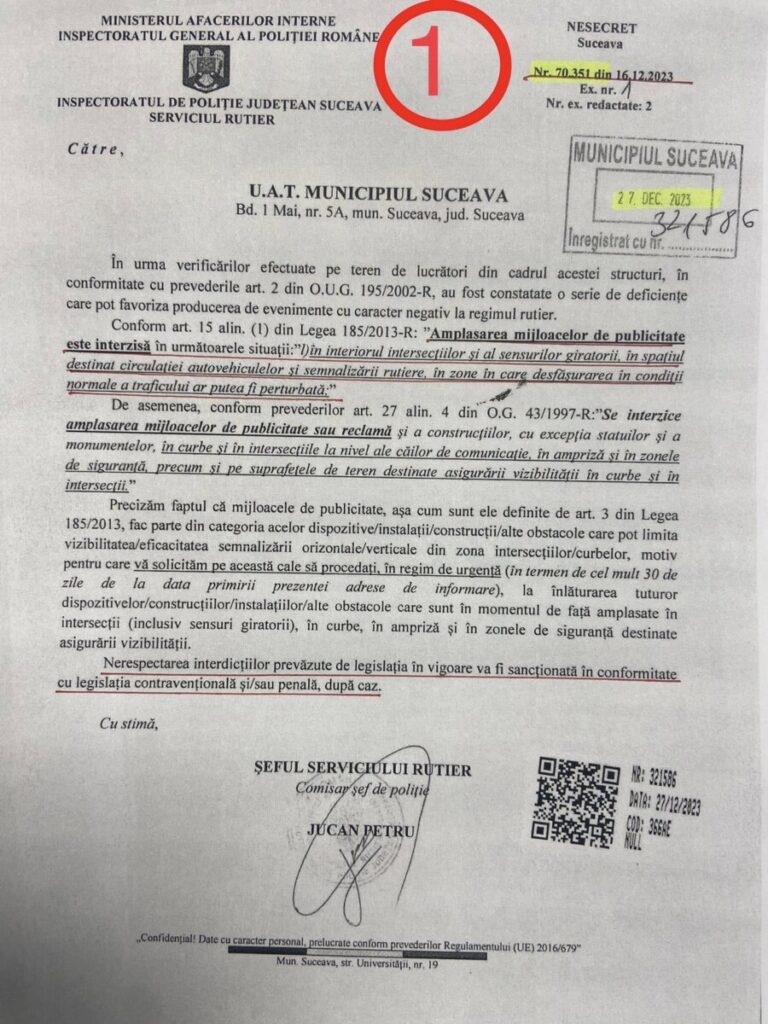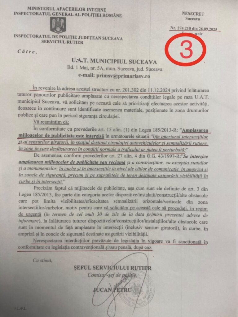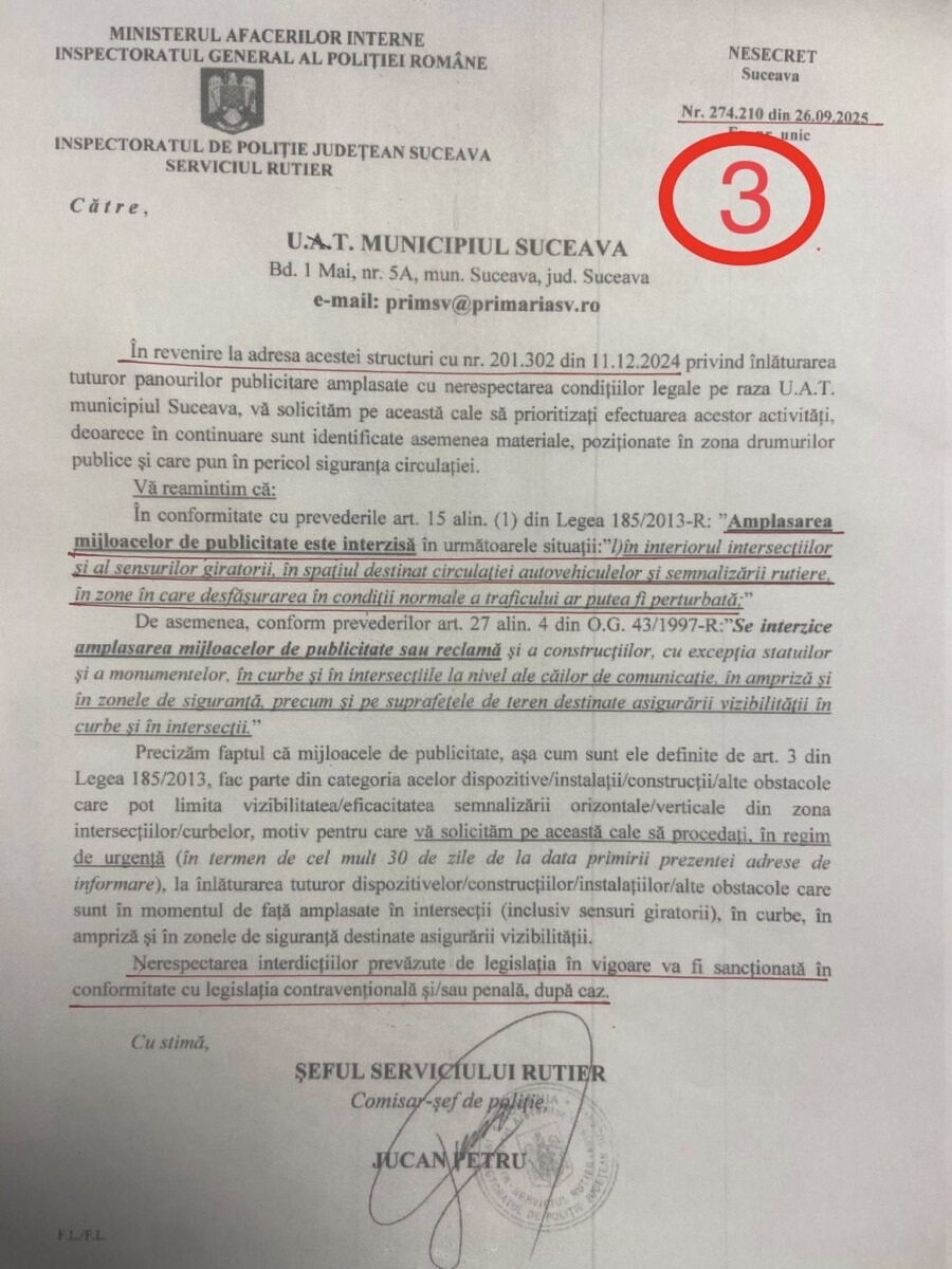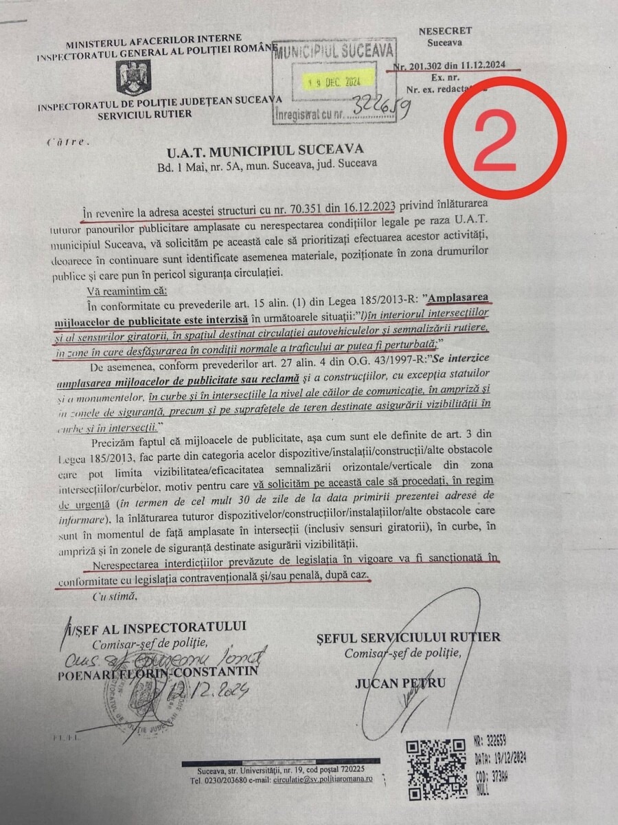 În centrul controverselor se află mai multe solicitări oficiale emise de Inspectoratul de Poliție Județean Suceava, care cere eliminarea urgentă a construcțiilor, panourilor publicitare și instalațiilor amplasate ilegal în intersecții, sensuri giratorii și alte spații publice.