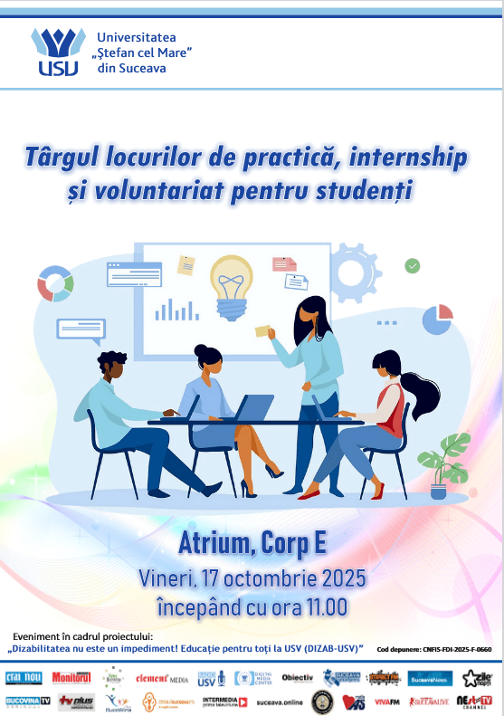 Vineri, 17 octombrie a.c., începând cu ora 11:00, în corpul E, Universitatea „Ștefan cel Mare” din Suceava (USV) organizează evenimentul Târgul locurilor de practică, internship și voluntariat pentru studenți, adresat studenților cu dizabilități și celorlalți studenți de la șase facultăți sucevene: Facultatea de Economie, Administrație și Afaceri,, Facultatea de Inginerie Alimentară, Facultatea de Drept și Științe Administrative, Facultatea de Educație Fizică și Sport, Facultatea de Psihologie și Științe ale Educației și Facultatea de Istorie, Geografie și Științe Sociale.
