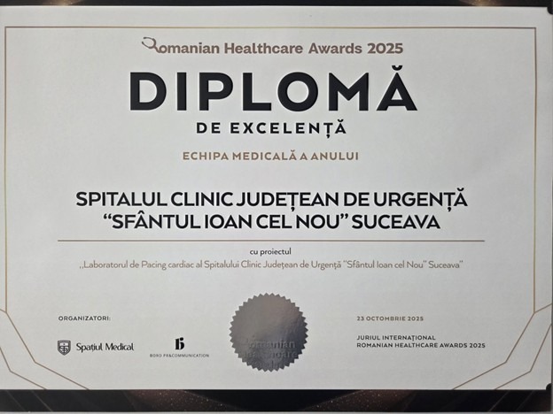 Echipa Laboratorului de Pacing Cardiac din cadrul Spitalului Clinic Județean de Urgență „Sfântul Ioan cel Nou” Suceava a fost distinsă cu Diploma de excelență la categoria Echipa Medicală a Anului, în cadrul galei Romanian Healthcare Awards 2025 – eveniment național cu juriu internațional care premiază performanța și buna practică în sistemul medical românesc.