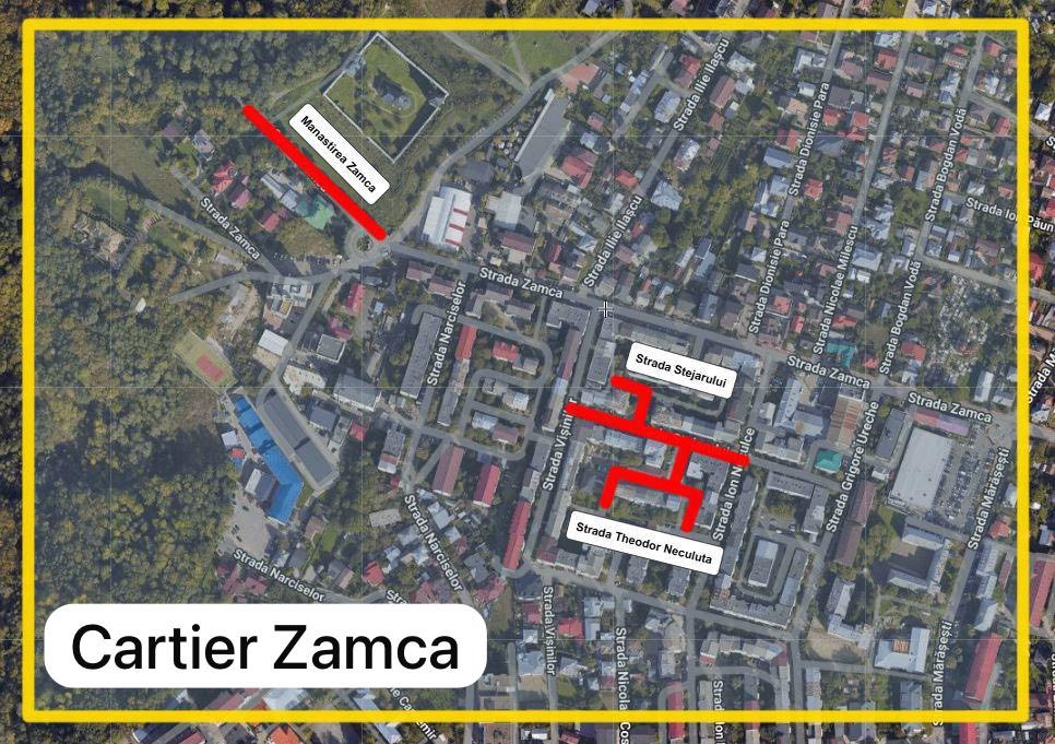 - Zona Zamca: străzile Stejarului, Theodor Neculuta și zona Mănăstirii Zamca;