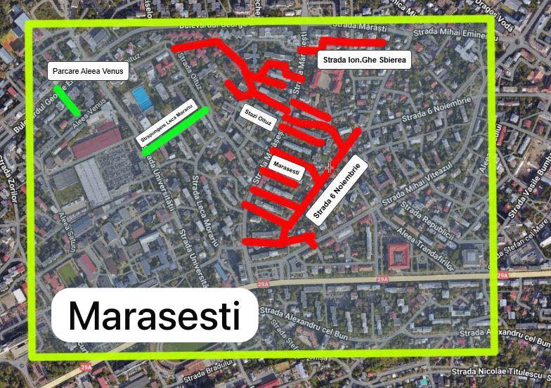 - Zona Universității – Mărășești: strada Oituz, cu ramificațiile de la strada Leca Morariu până la strada Mărășești;