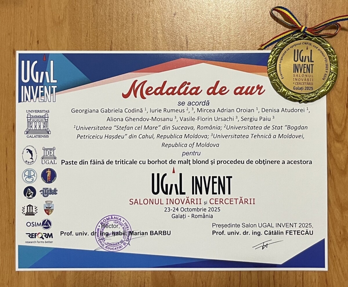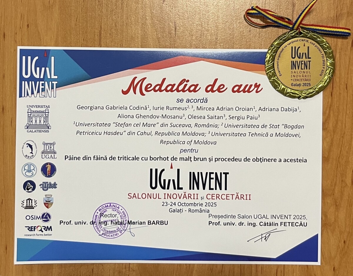 Facultatea de Inginerie Alimentară din cadrul Universității „Ștefan cel Mare” din Suceava, în parteneriat cu Universitatea Tehnică a Moldovei, a fost distinsă cu două medalii de aur la Salonul Inovării și Cercetării UGAL INVENT 2025, care s-a desfășurat între 23 și 24 octombrie a.c., la Universitatea „Dunărea de Jos” din Galați, anunță instituția academică suceveană.
