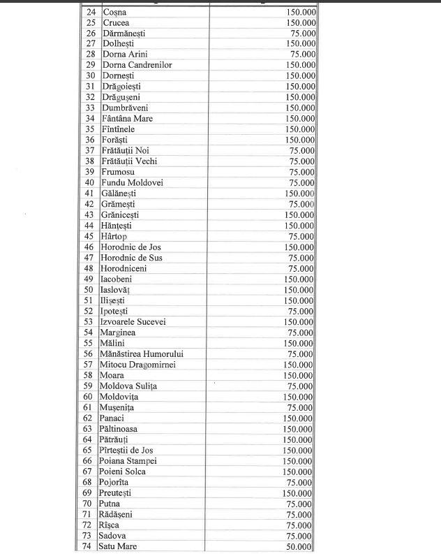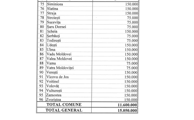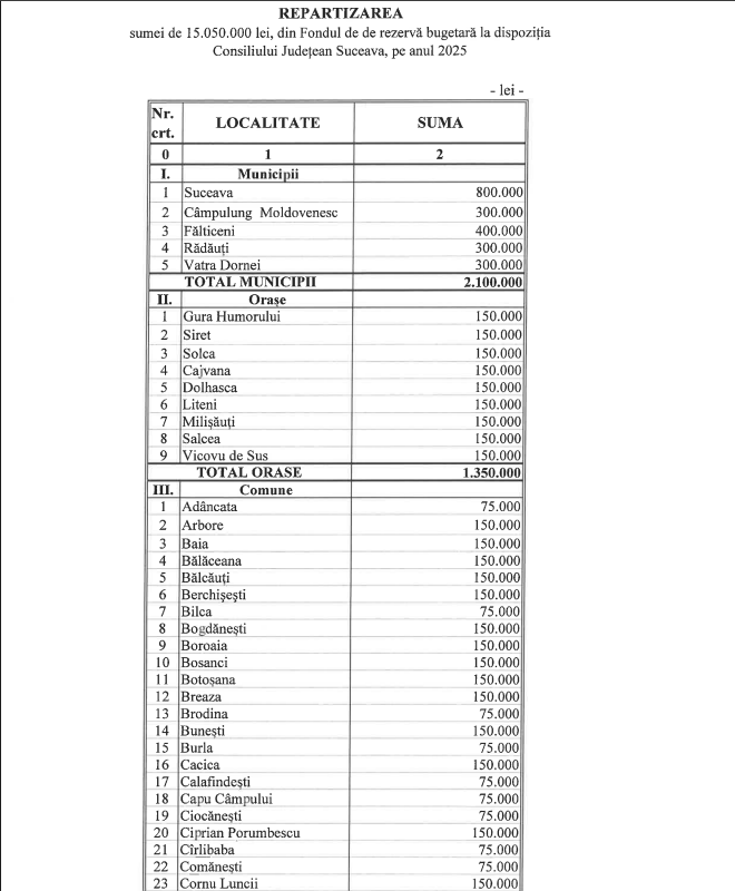 O alocare semnificativă este cea de 15.050.000 lei din Fondul de rezervă, destinată unităților administrativ-teritoriale aflate în dificultate extremă, pe baza solicitărilor primăriilor.