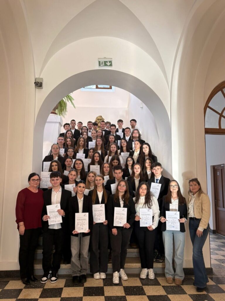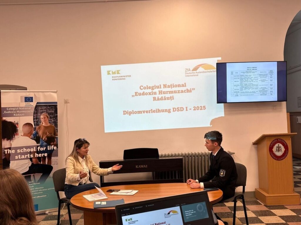 Într-o atmosferă de sărbătoare, 45 de elevi ai Colegiului Național „Eudoxiu Hurmuzachi” din Rădăuți au primit vineri, 14 noiembrie 2025, certificatele de competență lingvistică în limba germană „Deutsches Sprachdiplom I” (DSD I). Ceremonia, desfășurată începând cu ora 13:00 în holul central al instituției, a fost marcată de aplauze și felicitări din partea echipei manageriale, condusă de prof. dr. Adrian Puiu și prof. dr. Luminița Lăzărescu.