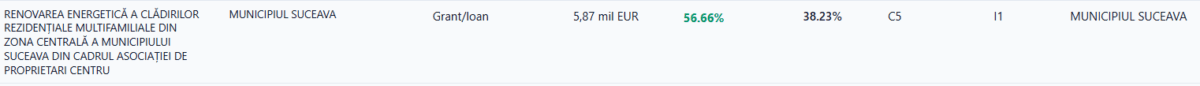 În ceea ce privește proiectul de renovarea energetică a clădirilor rezidențiale multifamiliale din zona centrală a Municipiului Suceava din cadrul Asociației de proprietari Centru, cu o valoare de 5,87 milioane de euro progresul fizic este de 56,66 la sută, iar progresul financiar de 38.23%.