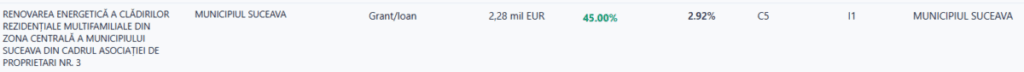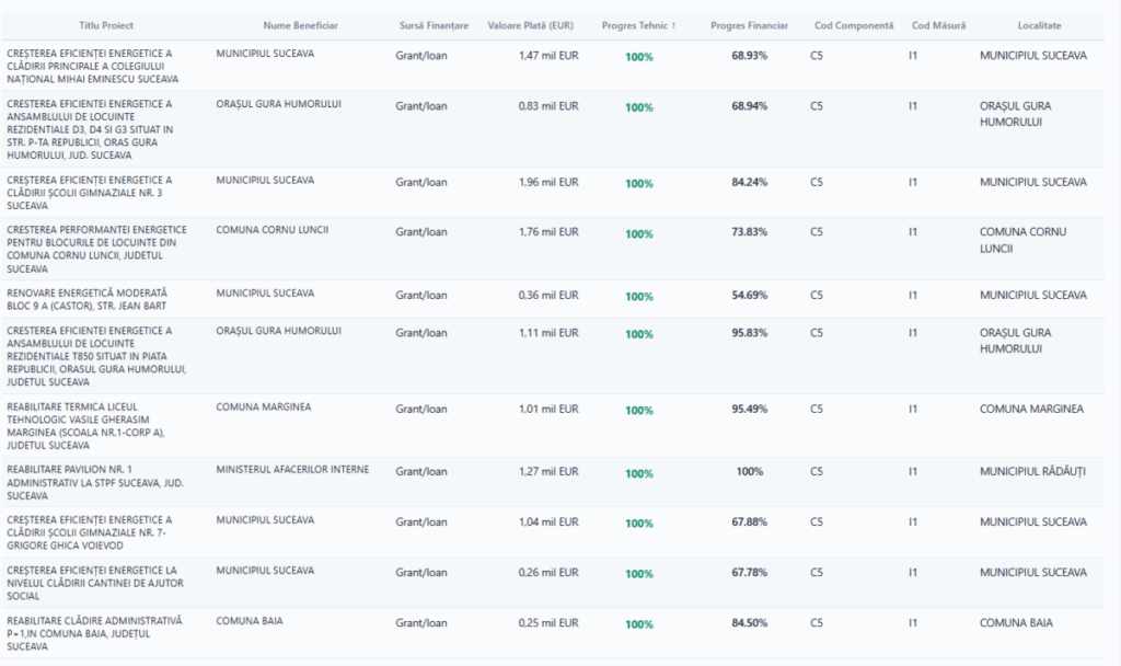 Aici, cel mai mic grad de decontare este de 2,92 la sută la proiectul Renovarea energetică a clădirilor rezidențiale multifamiliale din zona centrală a Municipiului Suceava din cadrul Asociației de proprietari Nr. 3, cu o valoare de 2,28 milioane de euro unde progresul fizic este de 45 la sută.