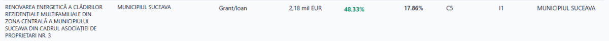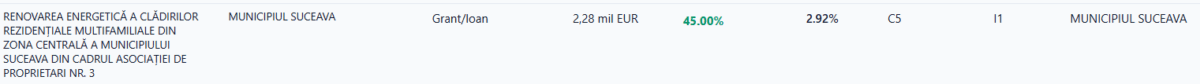 Cealaltă componentă a proiectului Renovarea energetică a clădirilor rezidențiale multifamiliale din zona centrală a Municipiului Suceava din cadrul Asociației de proprietari Nr. 3 în valoare de 2,18 milioane de euro are un progres fizic de 48.33%, iar progresul financiar este de doar 17.86%.