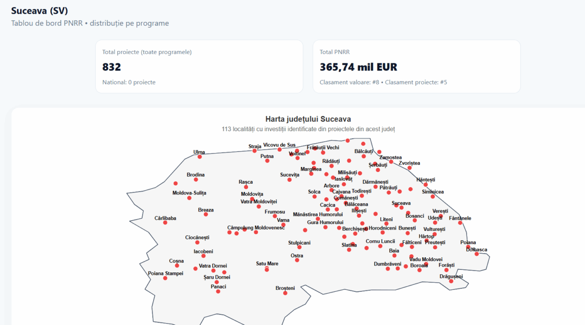 Municipiul Suceava domină detașat clasamentul local, cu 172 de proiecte în valoare de 144,80 milioane euro. Urmează Vicovu de Sus, Fălticeni, Vatra Dornei și Câmpulung Moldovenesc.