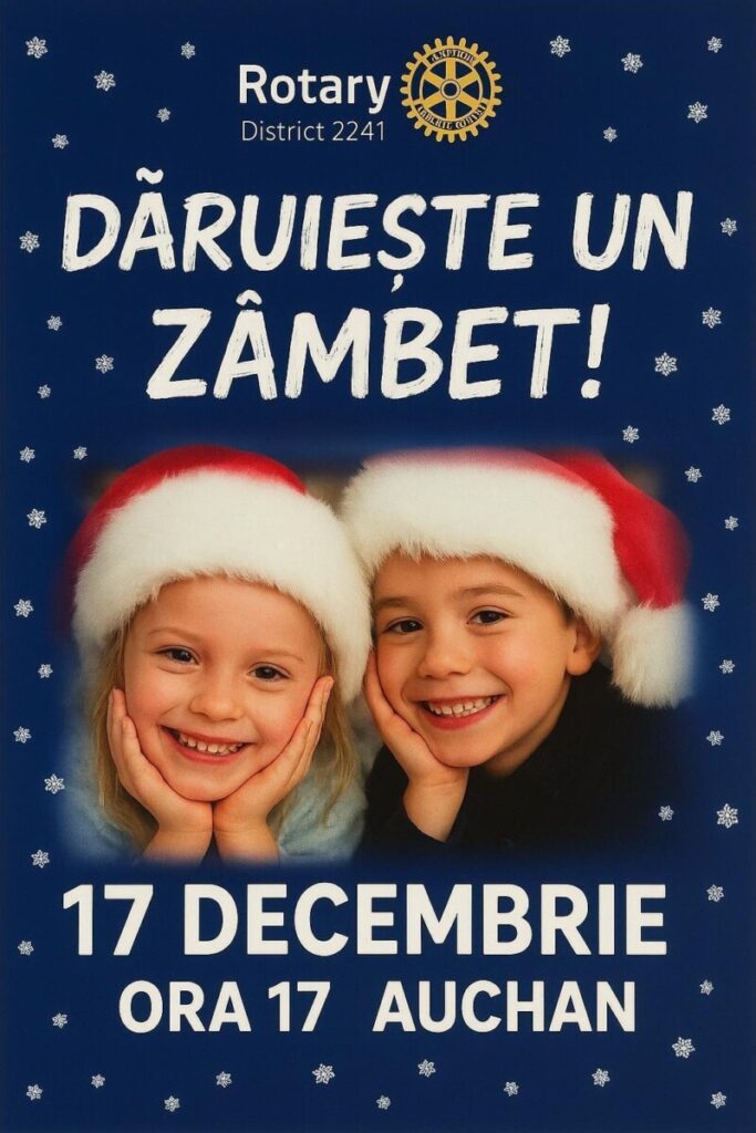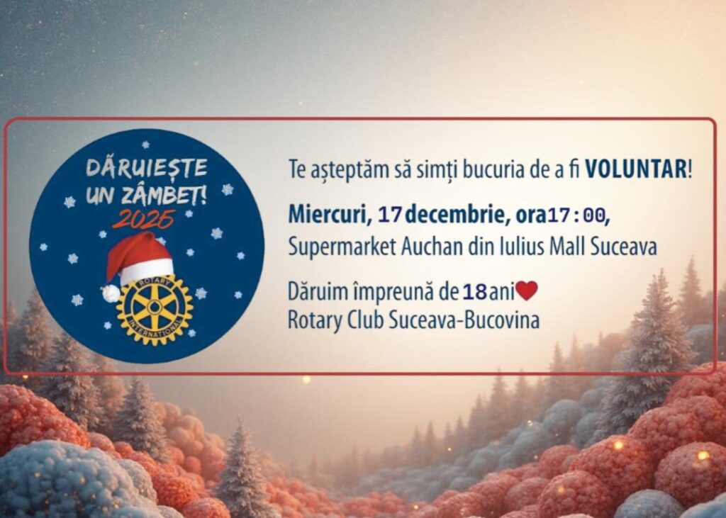 Clubul Rotary Suceava Bucovina va organiza miercuri, 17 decembrie 2024, începând cu ora 17:00, la Centrul Comercial Iulius Mall Suceava, zona Auchan, cea de-a XVIII-a ediție a evenimentului caritabil „Dăruiește un zâmbet”.
