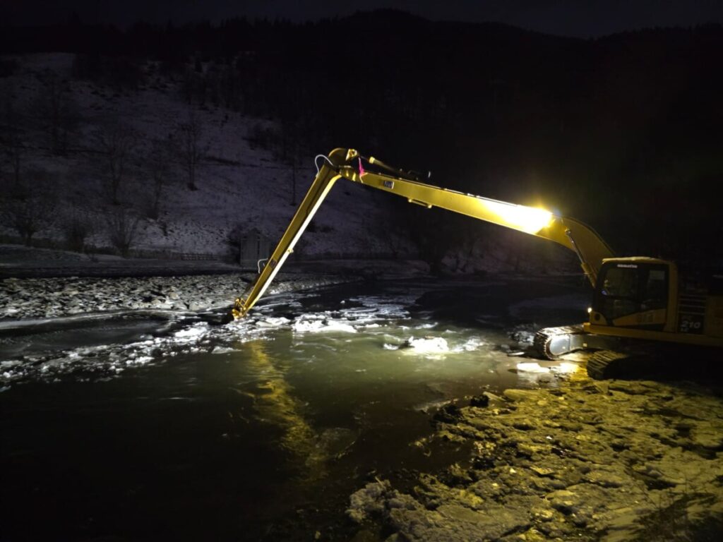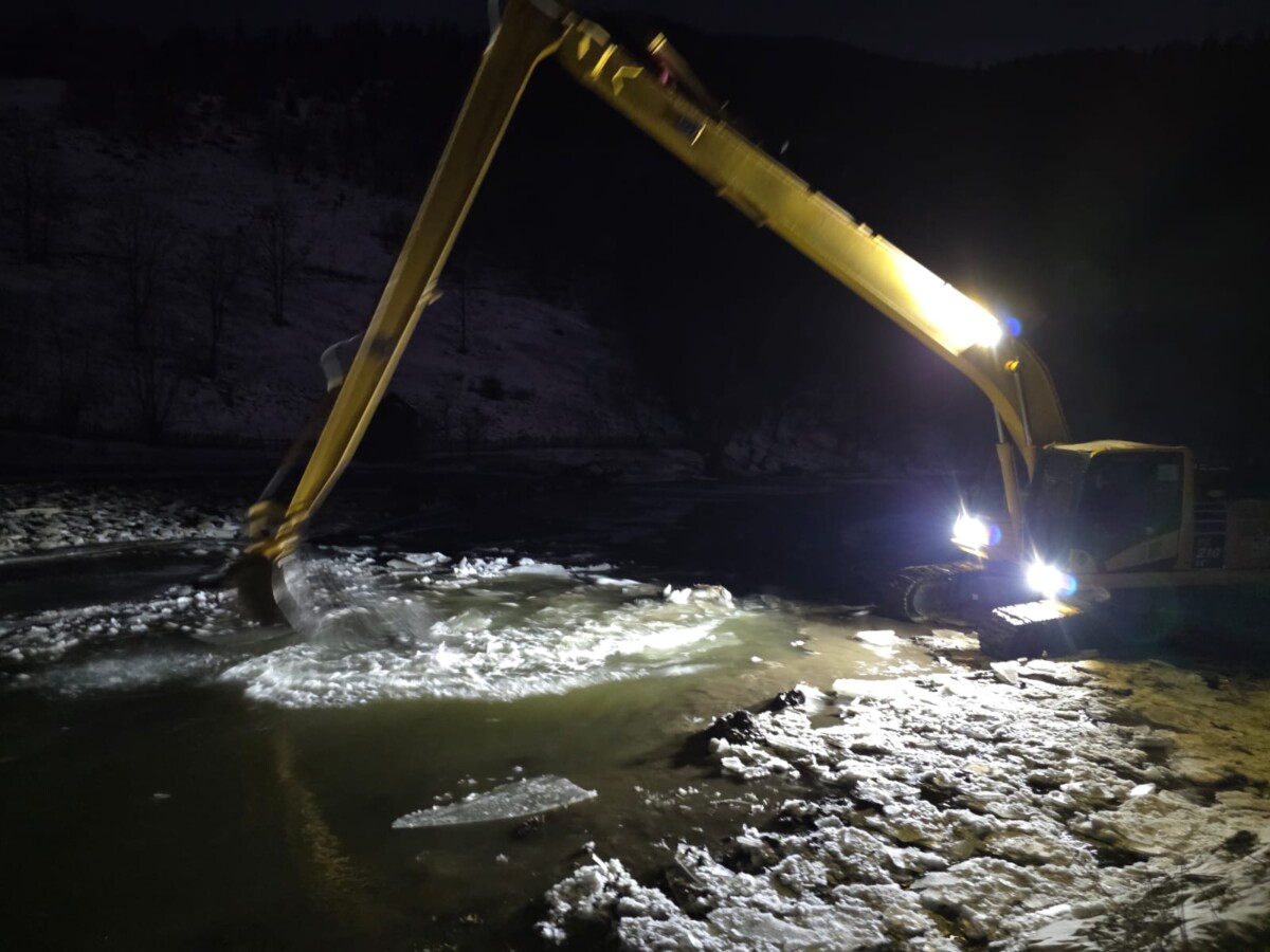 Echipele Sistemului de Gospodărire a Apelor Suceava sunt prezente permanent în zonă, sprijinite de un excavator Komatsu PC 210, utilizat pentru degajarea controlată a acumulărilor de gheață și menținerea secțiunii de scurgere a albiei.
