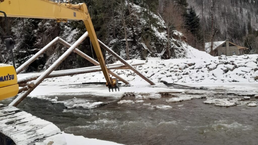 Utilizând un utilaj de tip excavator cu braț lung Komatsu, echipele au acționat atât pe sectorul amonte, cât și pe cel aval al zonei afectate, dislocând gheața și transportând o parte din aceasta în aval pentru a diminua efectele blocajelor.