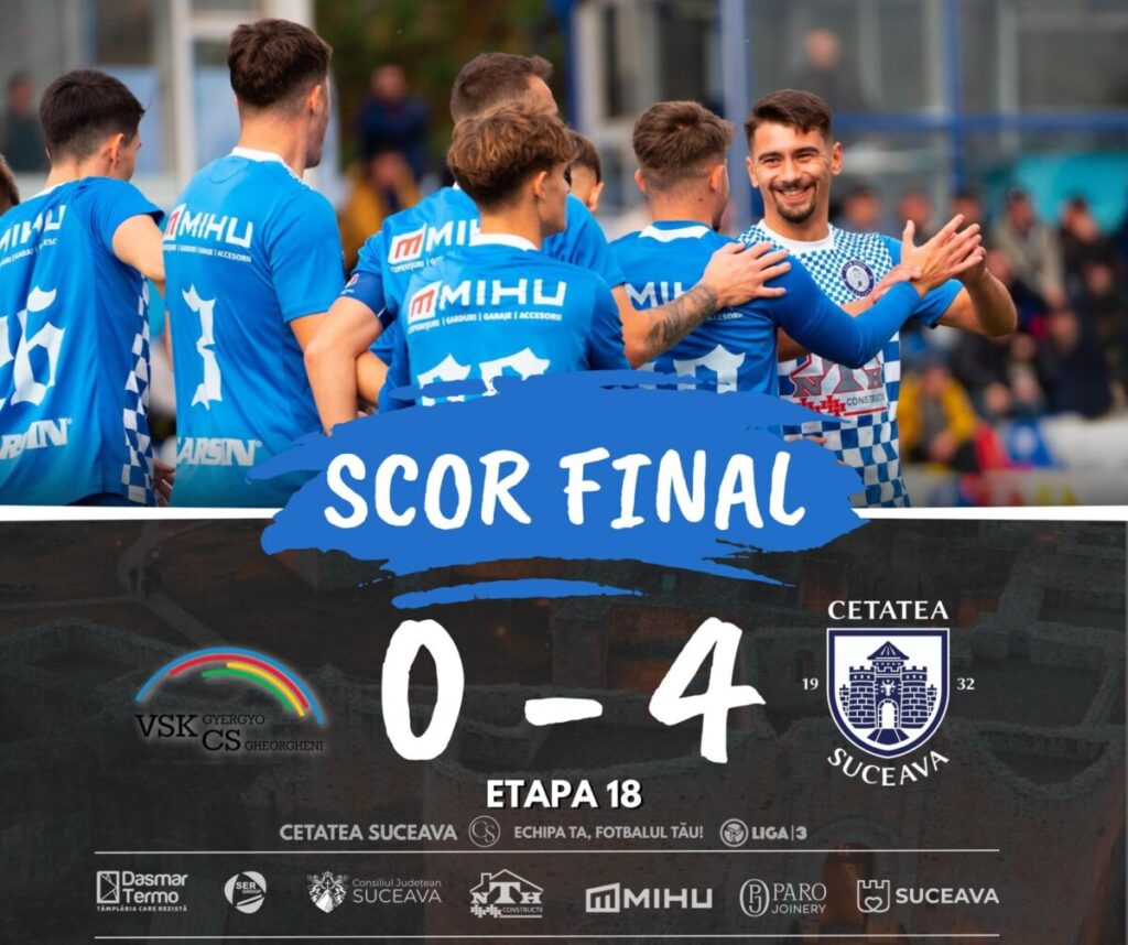 Cetatea 1932 Suceava a obținut o victorie clară și fără emoții, scor 4-0, în deplasarea din județul Harghita, împotriva echipei CS Gheorgheni, în cadrul etapei a XVIII-a a Seriei I din Liga a III-a.