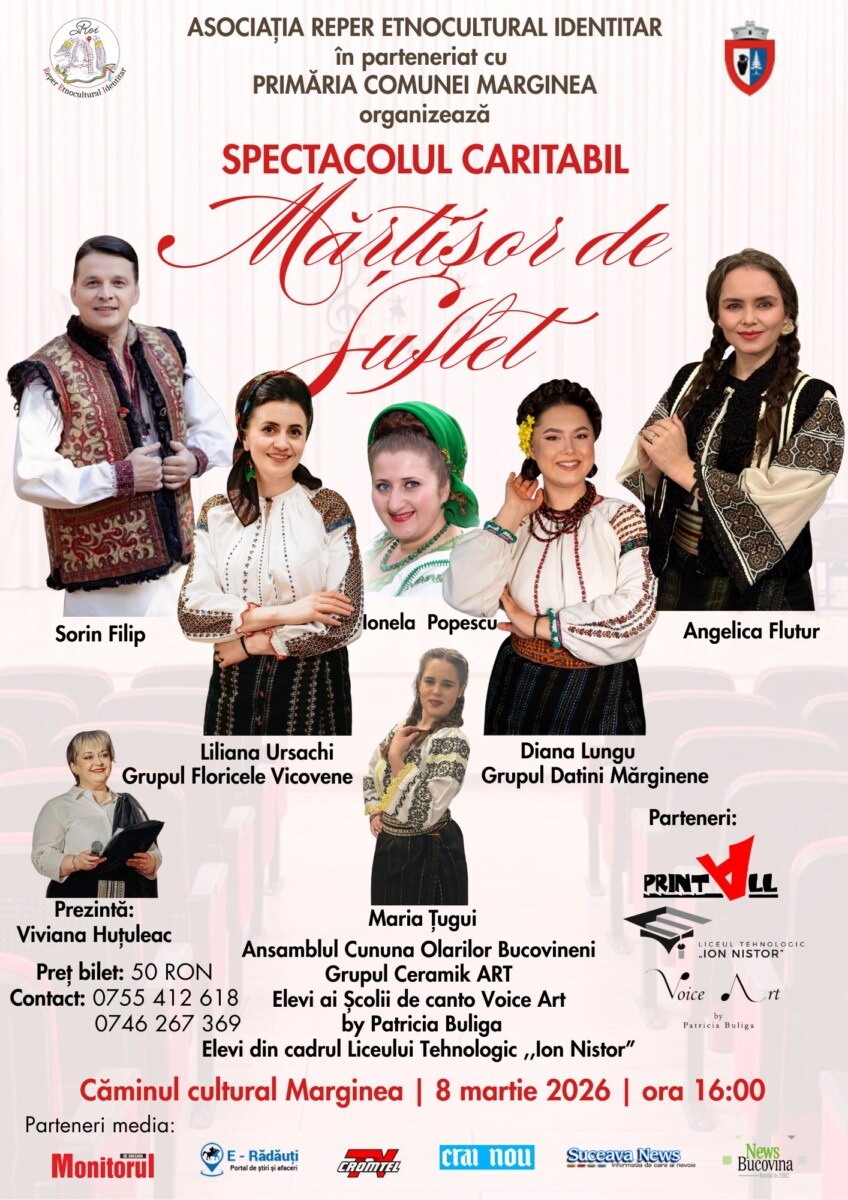 Asociația Reper Etnocultural Identitar, în parteneriat cu Primăria Comunei Marginea, organizează duminică, 8 martie 2026, începând cu ora 16:00, la Căminul Cultural din Marginea, spectacolul caritabil „Mărțișor de Suflet”. Evenimentul reunește artiști, ansambluri tradiționale, copii și tineri talentați din Bucovina într-un gest de solidaritate pentru familia Pașcaniuc din satul Ciumârna, al cărei cămin a fost mistuit de un incendiu devastator în noaptea de 18 ianuarie 2026.