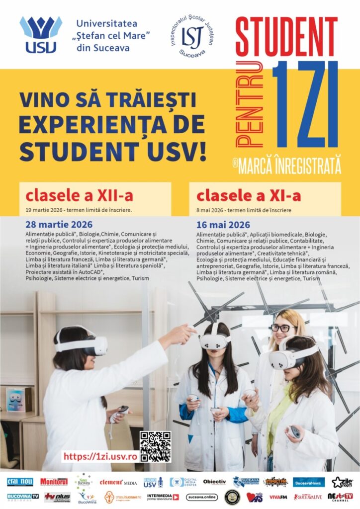 Universitatea „Ștefan cel Mare” din Suceava, în parteneriat cu Inspectoratul Școlar Județean Suceava, organizează cea de-a XV-a ediție a concursului interjudețean „Student pentru o zi”, un eveniment tradițional adresat elevilor de liceu din județele Suceava, Neamț, Bistrița-Năsăud, Botoșani, Iași și Vaslui.