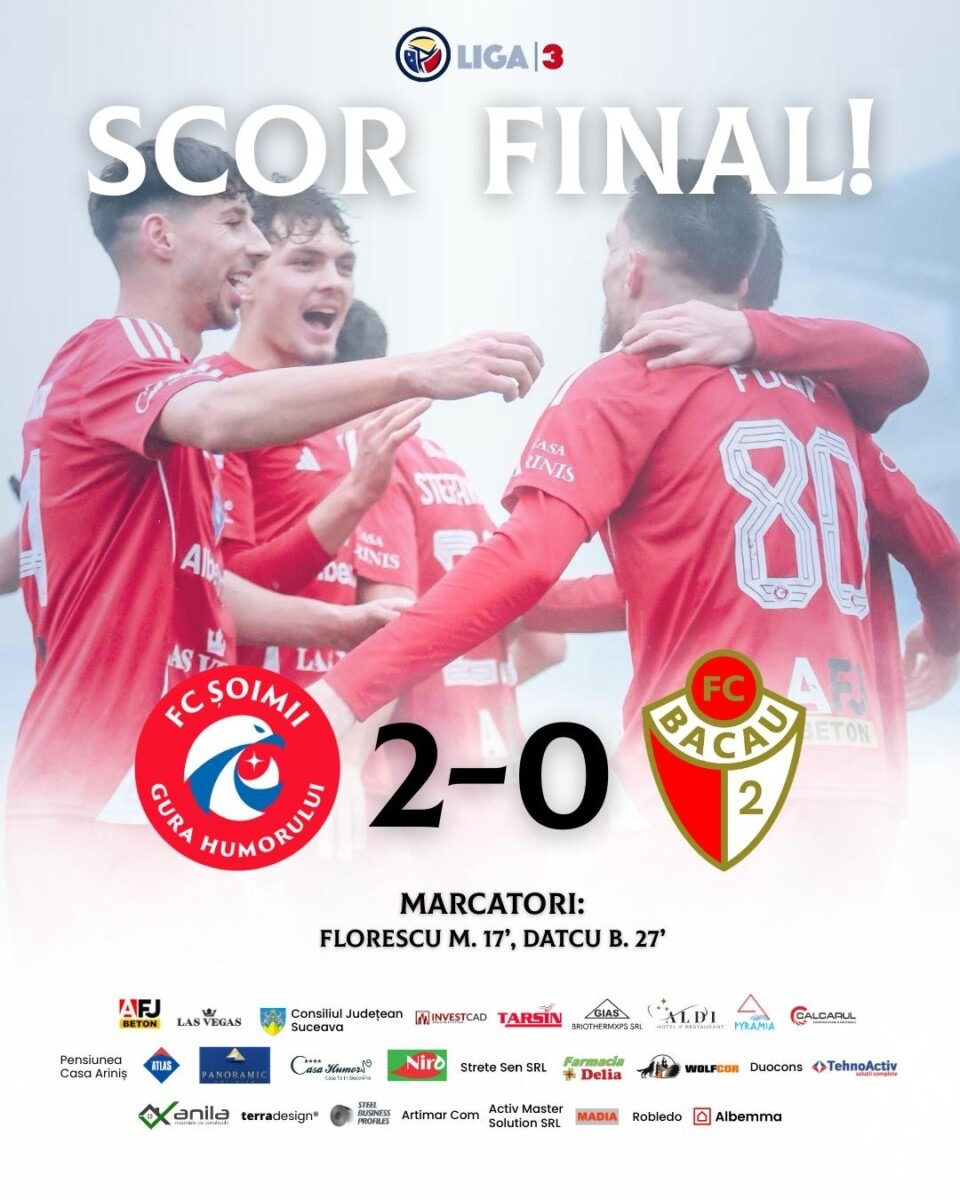 Șoimii Gura Humorului a obținut o victorie importantă și concludentă pe teren propriu, impunându-se cu scorul de 2-0 în fața formației FC Bacău II, în cadrul etapei a XX-a din Seria 1 a Ligii a III-a. Echipa antrenată de staff-ul tehnic a dominat partida de la un capăt la altul și și-a confirmat forma excelentă din acest sezon.