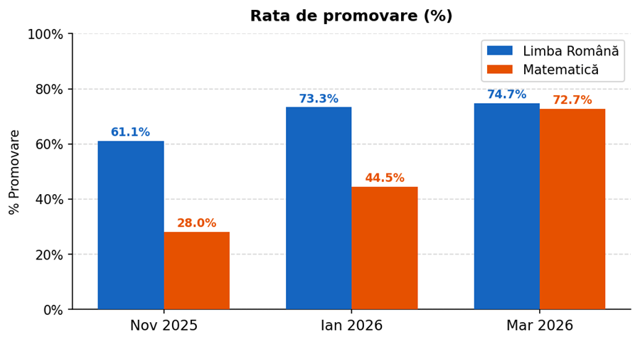 - Martie 2026: 72,69% promovare (+44,67 puncte procentuale față de noiembrie)