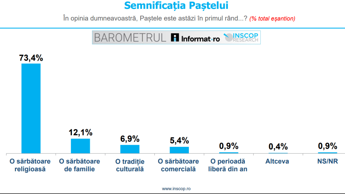 Sondajul relevă că 73,4% dintre respondenți consideră Paștele, în primul rând, o sărbătoare religioasă. Doar 12,1% o văd ca pe o sărbătoare de familie, 6,9% ca pe o tradiție culturală, iar 5,4% ca pe o sărbătoare comercială.