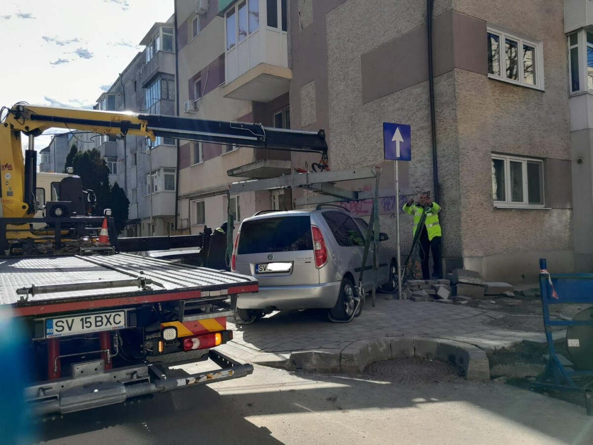 Polițiștii locali din cadrul Primăriei Municipiului Suceava au desfășurat o acțiune de ridicare a autovehiculelor staționate neregulamentar pe trotuar, pe strada Stejarului din cartierul Zamca.