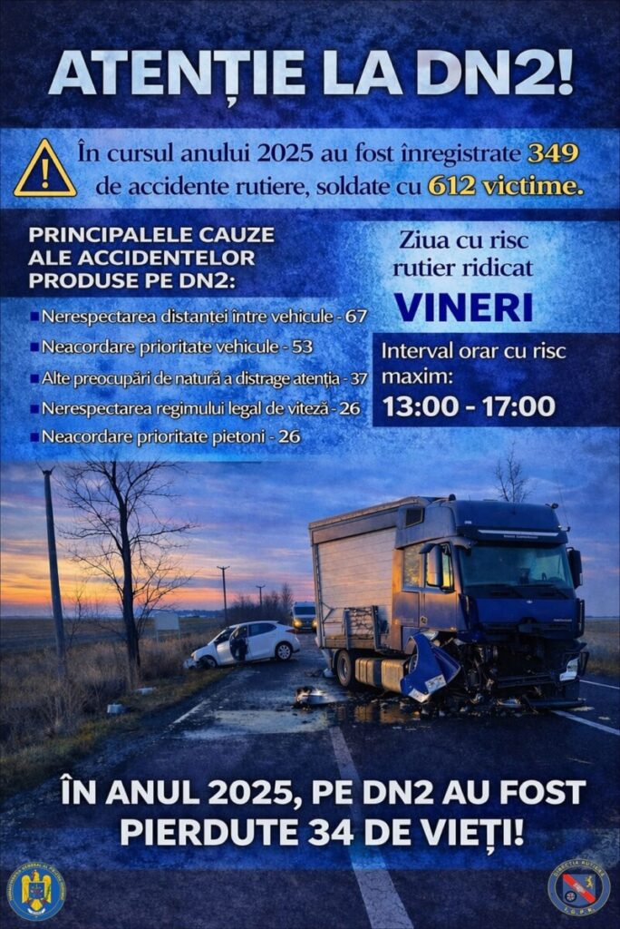 Pentru prevenirea accidentelor rutiere și creșterea gradului de siguranță în trafic, polițiștii rutieri din județul Suceava, împreună cu colegii din compartimentul de prevenire și partenerii instituționali, organizează vineri, 24 aprilie 2026, între orele 13:00 – 17:00, o acțiune preventivă pe DN2.