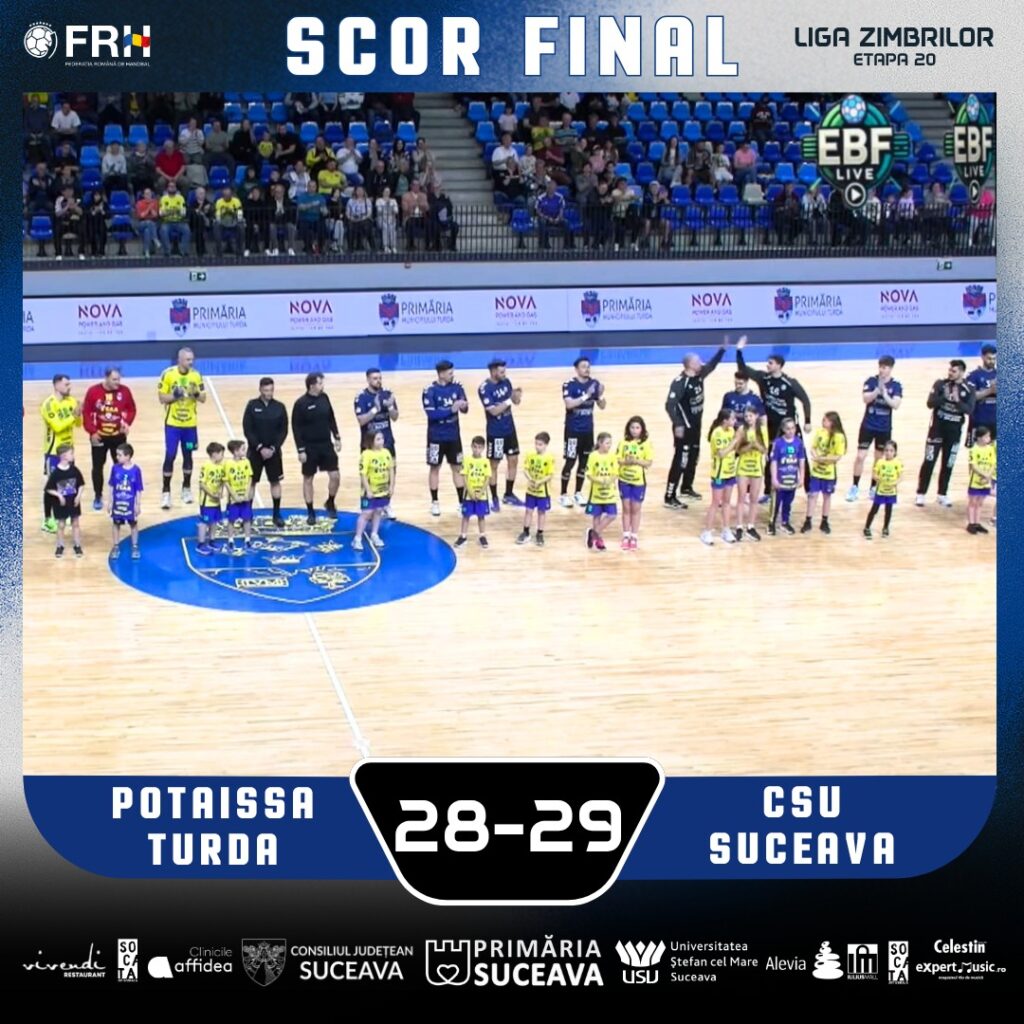 Echipa de handbal masculin CSU Suceava a reușit o performanță notabilă sâmbătă, 25 aprilie 2026, în etapa a 20-a a Ligii Naționale (Liga Zimbrilor). Pe terenul nou al formației Potaissa Turda, sucevenii s-au impus cu scorul strâns de 29-28, într-un meci extrem de disputat.