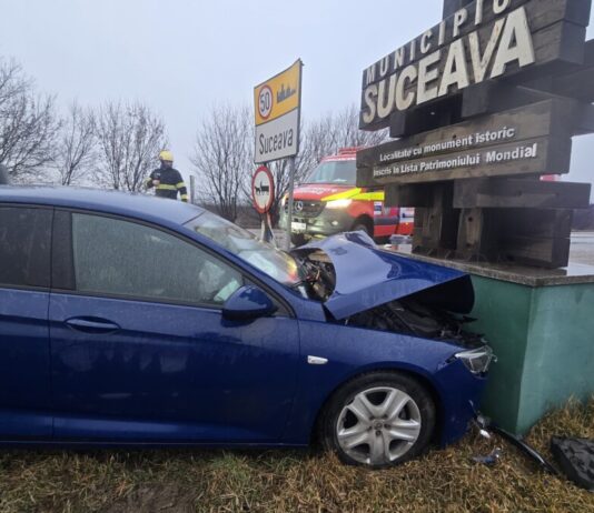 Un șofer a fost rănit după ce a intrat cu mașina în indicatorul de la intrarea în municipiul Suceava