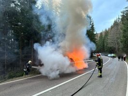 FOTO//Mașină în flăcări în Pasul Palma. Incendiul a pus în pericol fondul forestier, dar pompierii au reușit să lichideze rapid focul