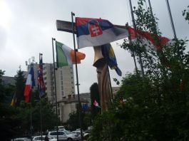 Drapelul național al Slovaciei, arborat invers în Piața Drapelelor UE din centrul Sucevei