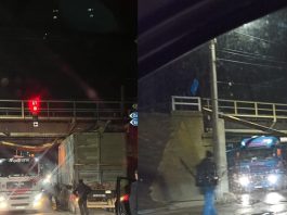 VIDEO-FOTO//Incident la pasajul de cale ferată din Ițcani după ce un camion a agățat limitatorul de înălțime