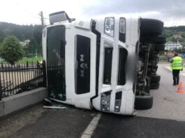 FOTO//Camion încărcat cu fier vechi, răsturnat în Vatra Dornei. Șoferul a fost evaluat medical de echipajul ambulanței, dar a refuzat transportul la spital