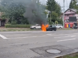 VIDEO//Incendiu la un autoturism în trafic în Suceava