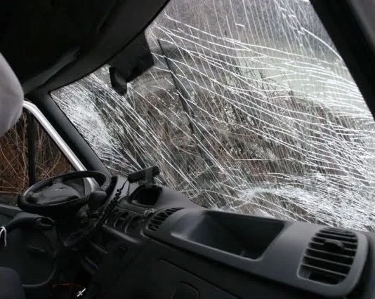 Microbuz scolar cu un singur pasager, acrosat de un autoturism