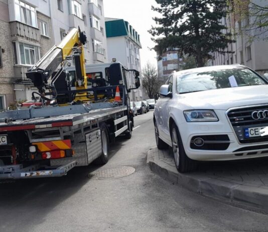 Poliția Locală Suceava ridică mașini parcate neregulamentar pe trotuar pe strada Stejarului din cartierul Zamca
