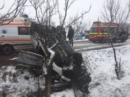 Autoturism răsturnat la Drăgușeni în urma unui accident rutier, două persoane fiind transportate la spital