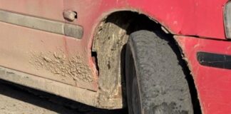 Cauciucuri extrem de uzate, cu caneluri abia vizibile la un autoturism...