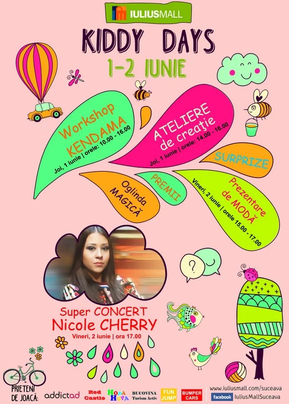 Distracția copiilor continuă și pe 2 iunie, cu și mai multe surprize. De la ora 17.00, Iulius Mall Suceava le oferă tuturor ștrengarilor un cadou muzical cu totul special și îi invită la un concert al îndrăgitei artiste Nicole Cherry. Ritmurile și versurile cunoscute de copiii și tinerii din toată țara se vor auzi la etajul Iulius Mall Suceava, spre încântarea tuturor sărbătoriților.