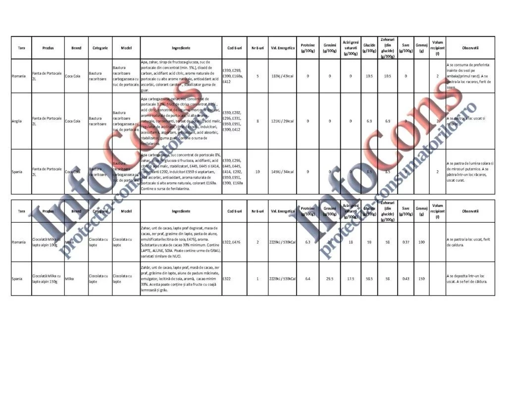 în lista de ingrediente și valori nutriționale, respectiv Fanta