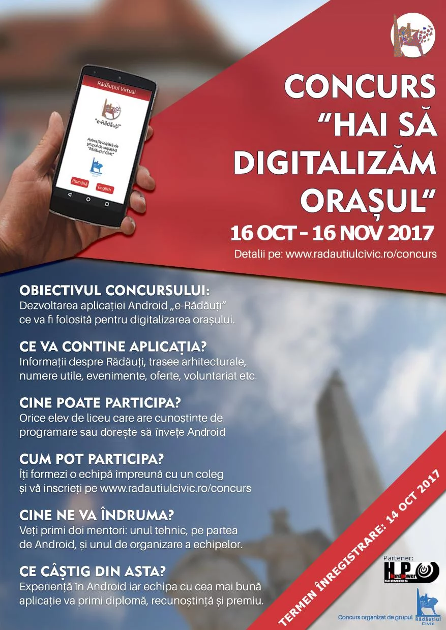 Grupul de inițiativă „Rădăuțiul civic” lansează în premieră un concurs adresat elevilor de liceu din Rădăuți pasionați de noile tehnologii pentru crearea unei aplicații mobile Android a municipiului denumită „e-Rădăuți”.