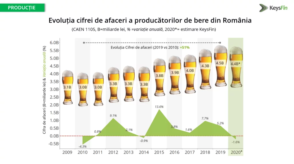 Cifra de afaceri a producătorilor de bere din România a crescut în anul 2019 cu 5,2% față de anul anterior și cu 51% comparativ cu anul 2010, atingând un nivel record de 4,5 miliarde de lei, potrivit analiștilor KeysFin. Cu toate acestea, pentru 2020 specialiștii KeysFin estimează o scădere de aproximativ 1,6%, în baza datelor de la INS, însă, în 2021, trendul este unul ascendent.