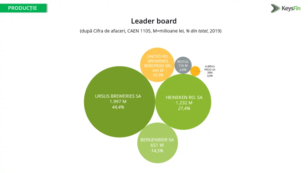 Conform cifrei de afaceri înregistrate în anul 2019, următoarele poziții sunt ocupate de UNITED ROMANIAN BREWERIES BEREPROD S.R.L. (465,5 milioane lei), ALBRAU PROD S.A. (39 milioane de lei), LIXID PROJECT S.R.L. (34,8 milioane de lei), BERMAS S.A. (32,8 milioane lei), MARTENS S.A. (21,6 milioane lei), FABRICA DE BERE BUNĂ S.R.L. (5,7 milioane lei) și nu în ultimul rând HB TRADITIONAL BREWERY S.R.L. (4,2 milioane lei).
