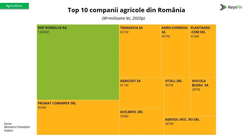 În ceea ce privește topul celor mai mari companii cu profil agricol, REGIA NAȚIONALĂ A PĂDURILOR ROMSILVA a ocupat și în 2020 poziția fruntașă, după o scădere anuală cu 10% a cifrei de afaceri. Pe locurile 2 și 3 se situează PROMAT COMIMPEX SRL (850 milioane lei) și TRANSAVIA SA (651 milioane lei).