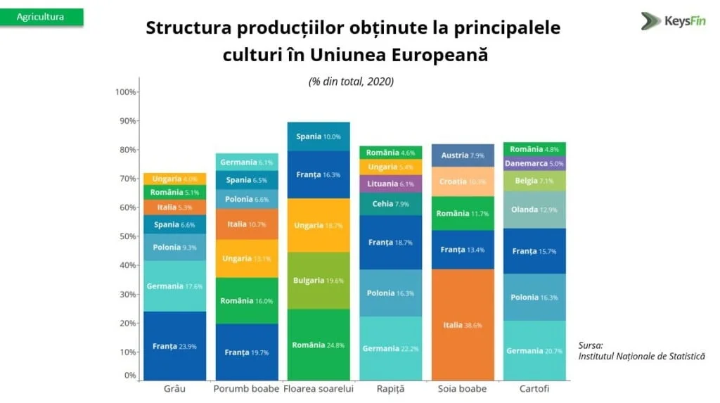 În ceea ce privește producția de grâu la nivelul UE, România a mai pierdut un loc în clasament, ajungând pe locul 6, cu 5,1% din total și o recoltă de 6,4 milioane de tone în anul 2020.
