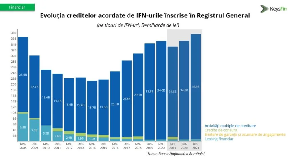 Valoarea creditelor acordate de instituțiile financiare nebancare (IFN) din România a atins nivelul record de peste 37,5 miliarde de lei la jumătatea anului 2021, după un avans de 6,7% în primele 6 luni, comparativ cu aceeași perioadă din 2020, potrivit ultimei analize KeysFin.