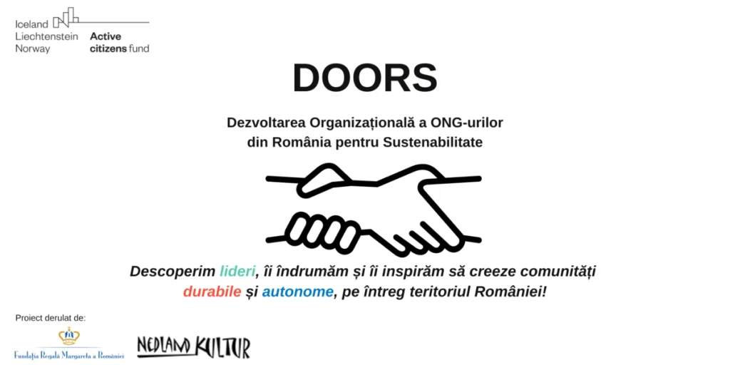 Fundația Regală Margareta a României lansează „DOORS – Dezvoltarea Organizațională a ONG-urilor din România pentru Sustenabilitate”, proiect derulat în parteneriat cu Nedland Kultur, cu sprijinul financiar Active Citizens Fund România, program finanțat de Islanda, Liechtenstein și Norvegia prin Granturile SEE 2014-2021. Scopul acestui proiect urmăreștedezvoltarea și sustenabilitatea a 20 ONG-uri care desfășoară activități în domeniile social, educație, sănătate, civic și mediu din zone geografice insuficient deservite, ce dispun de resurse umane și financiare limitate.
