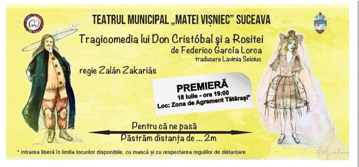 Astfel premiera spectacolului „Tragicomedia lui Don Cristóbal şi a Rositei”, de Federico García Lorca, în regia lui Zalán Zakariás va avea loc sâmbătă, 18 iulie, de la ora 19:00 în Parcul de Agrement Tătărași.