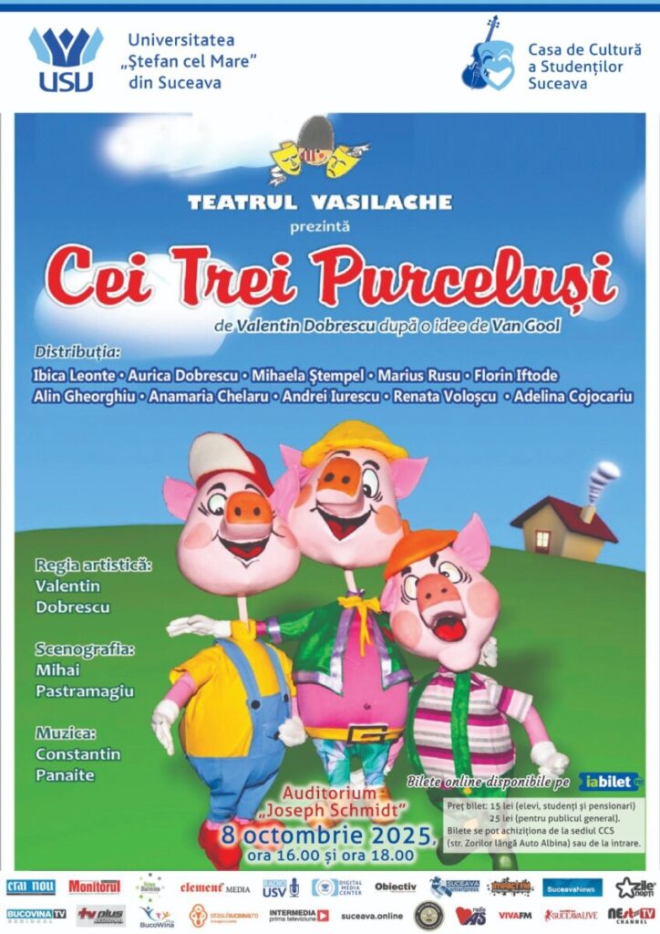Casa de Cultură a Studenților din cadrul Universității „Ștefan cel Mare” din Suceava continuă stagiunea de spectacole pentru copii cu o producție plină de umor și mister: „Cei Trei Purceluși”, adaptare și regie artistică semnată de Valentin Dobrescu. Cele două reprezentații vor avea loc miercuri, 8 octombrie 2025, de la orele 16:00 și 18:00, la Auditoriumul „Joseph Schmidt”.