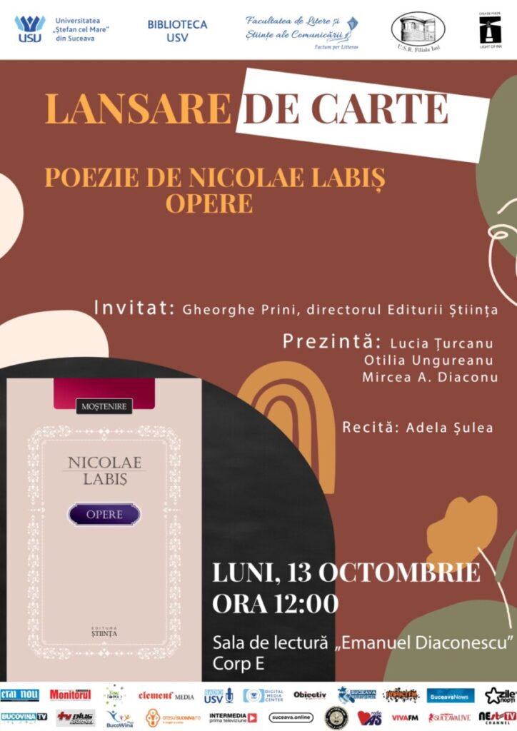Biblioteca Universității „Ștefan cel Mare” din Suceava invită iubitorii de literatură luni, 13 octombrie, ora 12:00, în Sala de lectură „Emanuel Diaconescu” din corpul E, la lansarea volumului „Nicolae Labiș. Opere”, publicat de Editura Știința din Chișinău, în cadrul colecției „Moștenire”.