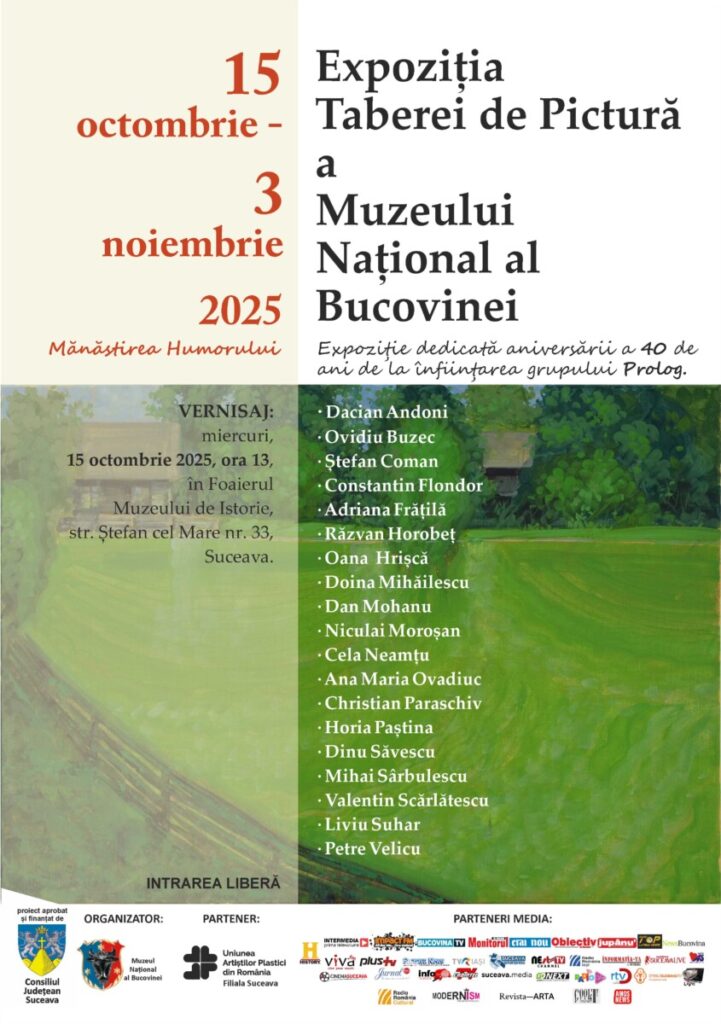 Muzeul Național al Bucovinei invită publicul interesat la vernisajul expoziției „Tabăra de pictură de la Mănăstirea Humorului – 2025”, care va avea loc miercuri, 15 octombrie 2025, ora 13, în Foaierul Muzeului de Istorie, Str. Ștefan cel Mare nr. 33, Suceava.