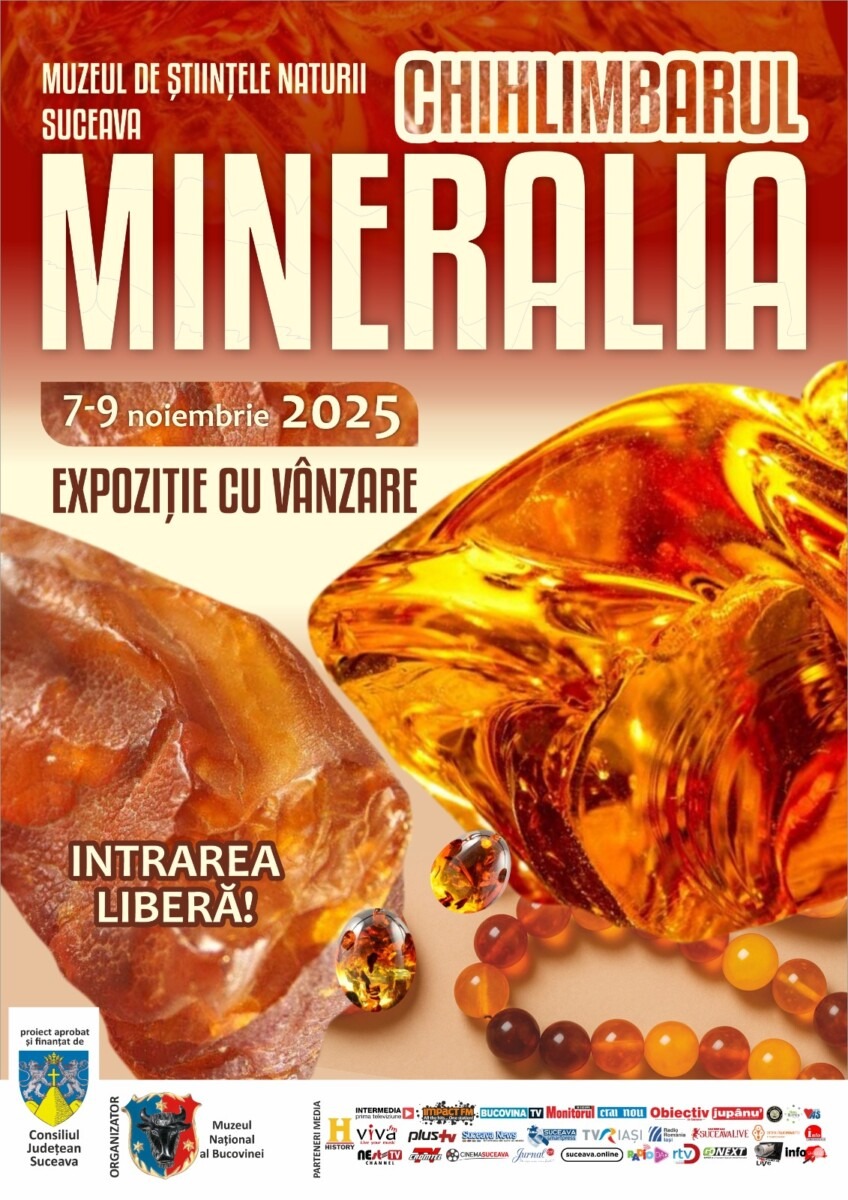 Muzeul Național al Bucovinei invită pasionații de minerale și bijuterii la ediția de toamnă a expoziției cu vânzare MINERALIA, care va avea loc în perioada 7–9 noiembrie 2025, la Muzeul de Științele Naturii din Suceava. Evenimentul, cu intrare liberă, va fi deschis zilnic între orele 10:00–18:00 (ultima intrare la 17:30) și pune în centrul atenției chihlimbarul, o comoară naturală cu o istorie fascinantă.